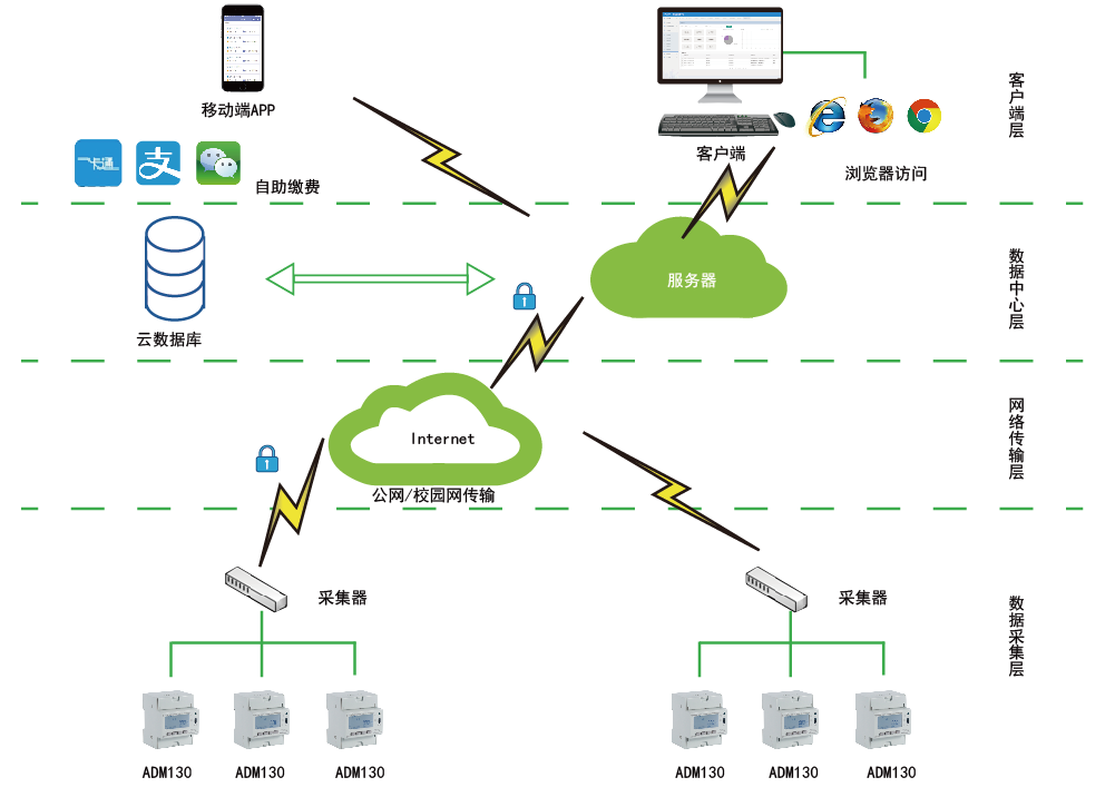AcrelCloud-3100学生宿舍版预付费云平台是与ADM130(一进三出)或ADF300L(多回路计量箱)预付费电能表配套的云平台。它是以电能管理网站和集中抄表软件为主,包括服务器,通讯管理机在内的集成系统。针对高校宿舍这一特殊应用场合研发,主要实现电能监控、时间管理、恶性负载管理、预付费管理等在高校宿舍中存在的特殊需求。